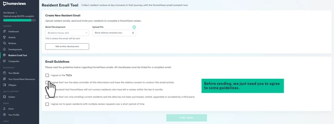 - Residents can only leave one review every 6 months. If you upload an email address for a resident who has left a review within the last 6 months, don’t worry, we will not send an email request to them. For example, if you upload a spreadsheet with 20 email addresses of residents and 2 of these email addresses have left a review on the HomeViews site within the last 6 months, when you press "Send", our database will do a quick scan and find that 2 email addresses have left a review within 6 months and will not send them an email; the other 18 emails will send.
