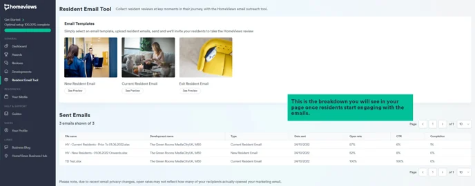 Once you've sent a batch of emails out to your residents, you will see a breakdown of the Open Rate, Click Through Rate (CTR) and Completion rate of each campaign.